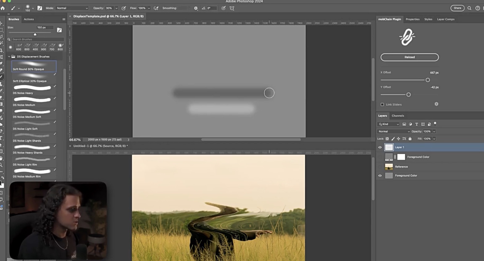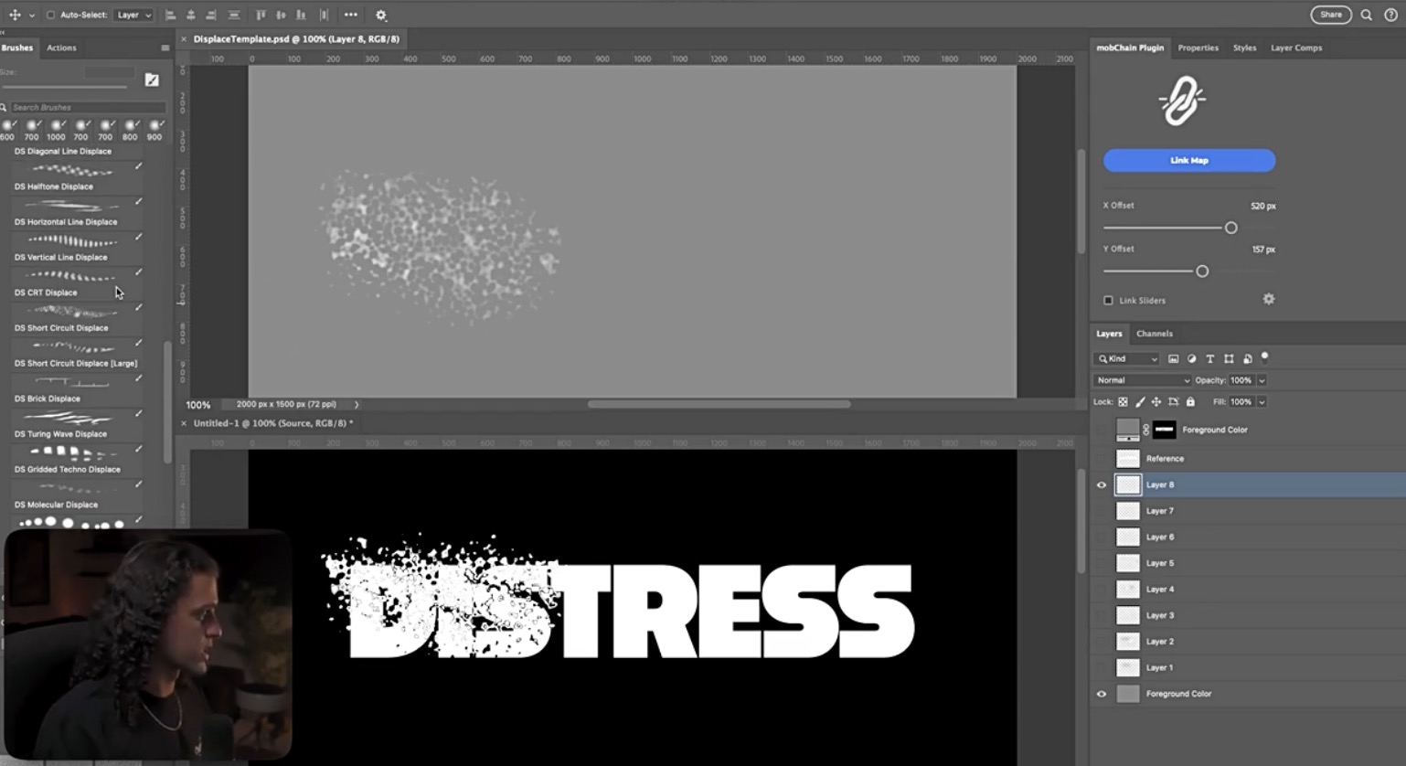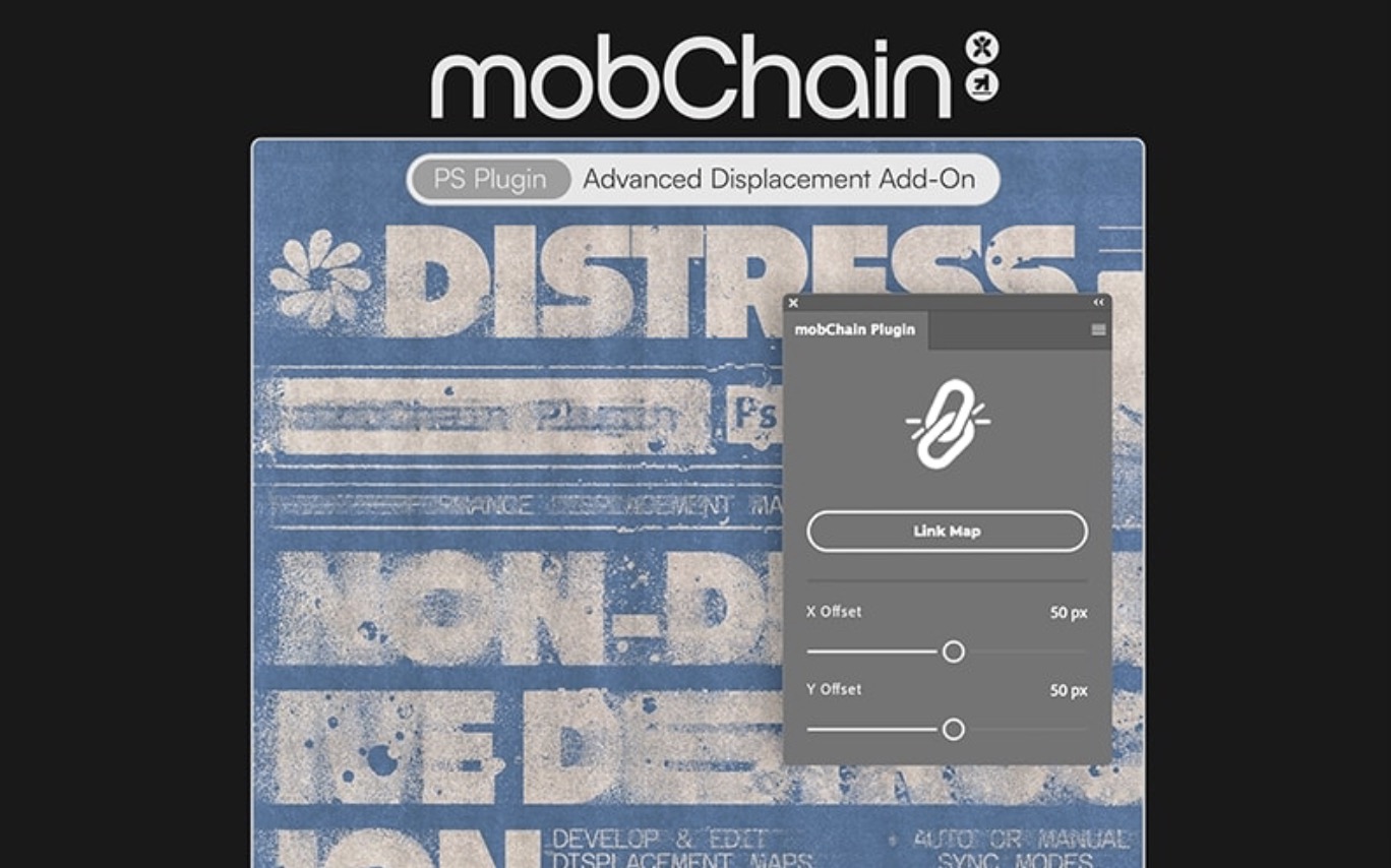 mobChain是您轻松快速地置换和处理文字及图像的最佳伙伴。置换贴图时,您再也不用担心无法准确定位和得到糟糕的结果了。此插件可创建一个带有参考图层的置换图模板,并将其链接到您的主文档。这意味着您可以在置换图上进行任何编辑,并立即查看更新后的置换结果。您还可以使用插件对话框中的 X 和 Y 滑块动态控制偏移扭曲。借助这款强大的工具,您现在可以实时开发和微调置换图!